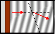 The diagram on the right shows an example of refraction in water waves. Ripples travel from the left and pass over a shallower region inclined at an angle to the wavefront. The waves travel more slowly in the shallower water, so the wavelength decreases and the wave bends at the boundary. The dotted line represents the normal to the boundary. The dashed line represents the original direction of the waves. The phenomenon explains why waves on a shoreline never hit the shoreline at an angle. Whichever direction the waves travel in deep water, they always refract towards the normal as they enter the shallower water near the beach.