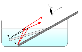 Refraction of light waves in water. The dark rectangle represents the actual position of a pencil sitting in a bowl of water. The light rectangle represents the apparent position of the pencil. Notice that the end (X) looks like it is at (Y), a position that is considerably shallower than (X).