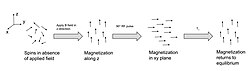 Magnetization builds up along the z-axis in the presence of a magnetic field, B0, such that the magnetic dipoles in the sample will, on average, align with the z-axis summing to a total magnetization Mz. This magnetization along z is defined as the equilibrium magnetization; magnetization is defined as the sum of all magnetic dipoles in a sample. Following the equilibrium magnetization, a 90° radiofrequency (RF) pulse flips the direction of the magnetization vector in the xy-plane, and is then switched off. The initial magnetic field B0, however, is still applied. Thus, the spin magnetization vector will slowly return from the xy-plane back to the equilibrium state. The time it takes for the magnetization vector to return to its equilibrium value, Mz, is referred to as the longitudinal relaxation time, T1.[19] Subsequently, the rate at which this happens is simply the reciprocal of the relaxation time: [math]\displaystyle{ \frac {1} {T1} = R1 }[/math]. Similarly, the time in which it takes for Mxy to return to zero is T2, with the rate [math]\displaystyle{ \frac {1} {T2} = R2 }[/math].[20] Magnetization as a function of time is defined by the Bloch equations.