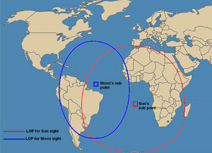 Celestial navigation systems are based on observation of the positions of the Sun, Moon, planets and navigational stars. Such systems are in use as well for terrestrial navigating as for interstellar navigating. By knowing which point on the rotating Earth a celestial object is above and measuring its height above the observer's horizon, the navigator can determine his distance from that subpoint. A nautical almanac and a marine chronometer are used to compute the subpoint on Earth a celestial body is over, and a sextant is used to measure the body's angular height above the horizon. That height can then be used to compute distance from the subpoint to create a circular line of position. A navigator shoots a number of stars in succession to give a series of overlapping lines of position. Where they intersect is the celestial fix. The Moon and Sun may also be used. The Sun can also be used by itself to shoot a succession of lines of position (best done around local noon) to determine a position.[24]