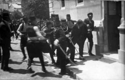 The assassination excessively intensified the existing traditional religion-based ethnic hostilities in Bosnia. However, in Sarajevo itself, Austrian authorities encouraged[142][143] violence against the Serb residents, which resulted in the Anti-Serb riots of Sarajevo, in which Catholic Croats and Bosnian Muslims killed two and damaged numerous Serb-owned buildings. Writer Ivo Andrić referred to the violence as the "Sarajevo frenzy of hate."[144] Violent actions against ethnic Serbs were organized not only in Sarajevo but also in many other larger Austro-Hungarian cities in modern-day Croatia and Bosnia and Herzegovina.[145] Austro-Hungarian authorities in Bosnia and Herzegovina imprisoned and extradited approximately 5,500 prominent Serbs, 700 to 2,200 of whom died in prison. 460 Serbs were sentenced to death and a predominantly Muslim[146][147][148] special militia known as the Schutzkorps was established and carried out the persecution of Serbs.[149]