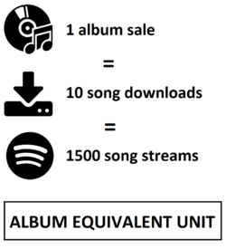 The album-equivalent unit, or album equivalent,[1] is a measurement unit in music industry to define the consumption of music that equals the purchase of one album copy.[2][3] This consumption includes streaming and song downloads in addition to traditional album sales. The album-equivalent unit was introduced in the mid-2010s as an answer to the drop of album sales in the 21st century. Album sales more than halved from 1999 to 2009, declining from a $14.6 to $6.3 billion industry.[4] For instance, the only albums that went platinum in the United States in 2014 were the Frozen soundtrack and Taylor Swift's 1989, whereas several artists' works had in 2013.[5][6]