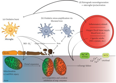 Others propose an oligodendrocyte stress as primary dysfunction, which activates microglia creating the NAWM areas[133] and others propose a yet-unknown intrinsic CNS trigger induces the microglial activation and clustering, which they point out could be again axonal injury or oligodendrocyte stress.[134]