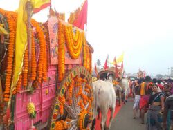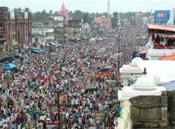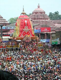 The annual festival called the Ratha yatra celebrated in June or July every year in eastern states of India is dedicated to Jagannath. His image, along with the other two associated deities, is ceremoniously brought out of the sacrosanctum (Garbhagriha) of his chief temple in Jagannath Puri (Odia: Bada Deula). They are placed in a chariot which is then pulled by numerous volunteers to the Gundicha Temple, (located at a distance of nearly 3 km or 1.9 mi). They stay there for a few days, after which they are returned to the main temple. Coinciding with the Ratha Yatra festival at Puri, similar processions are organized at Jagannath temples throughout the world. During the festive public procession of Jagannath in Puri lakhs of devotees visit Puri to see Lord Jagganath in chariot.[24]