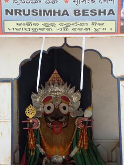 In the Jagannath tradition, he has the attributes of all the avatars of Krishna/Vishnu. This belief is celebrated by dressing him and worshipping him as different avatars on special occasions.[46] The Puranas relate that the Narasimha Avatar of Vishnu appeared from a wooden pillar. It is therefore believed that Jagannath is worshipped as a wooden murti or Daru Brahma with the Shri Narasimha hymn dedicated to the Narasimha Avatar.[47] Every year in the month of Bhadra, Jagannath is dressed and decorated in the form of the Vamana avatar of Vishnu.[45] Jagannath appeared in the form of Rama, another avatar of Vishnu, to Tulsidas, who worshipped him as Rama and called him Raghunath during his visit to Puri in the 16th century.[48][49]