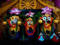 Prior to the advent of ISKCON movement, Jagannath and his most important festival, the annual Ratha Yatra, were relatively unknown in the West.[131] Soon after its founding, ISKCON started founding temples in the West. A. C. Bhaktivedanta Swami Prabhupada popularly called Shrila Prabhupada, the founder of ISKCON, selected Jagannath as one of the chosen forms of Krishna installing an deity of Jagannath in ISKCON temples around the world.[132] ISKCON has promoted Jagannath throughout the world. Annual Ratha Yatra festival is now celebrated by ISKCON in many cities in the West where they are popular attractions.[131] ISKCON devotees worship Jagannath and take part in the Ratha Yatra in memory of Chaitanya Mahaprabhu spending 18 years in Puri worshipping Jagannath and taking an active part in the Ratha Yatra[133]