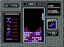 If the player cannot make the blocks disappear quickly enough, the field will start to fill; when the pieces reach the top of the field and prevent the arrival of additional pieces, the game ends.[3] At the end of each game, the player receives a score based on the number of lines that have been completed.[4](p16) Theoretically, the game never ends with the player's victory. The player can complete only as many lines as possible before an inevitable loss.[2]