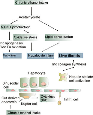 The mechanism of ALD is not completely understood. 80% of alcohol passes through the liver to be detoxified. Chronic consumption of alcohol results in the secretion of pro-inflammatory cytokines (TNF-alpha, Interleukin 6 [IL6] and Interleukin 8 [IL8]), oxidative stress, lipid peroxidation, and acetaldehyde toxicity. These factors cause inflammation, apoptosis and eventually fibrosis of liver cells. Why this occurs in only a few individuals is still unclear. Additionally, the liver has tremendous capacity to regenerate and even when 75% of hepatocytes are dead, it continues to function as normal.[8]