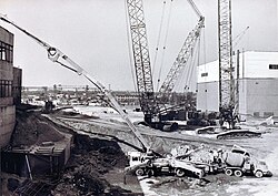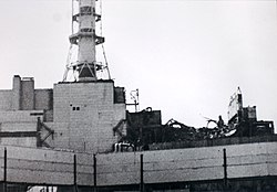 Nowadays, the remnants of the reactor are covered with a steel structure officially called "Object Shelter" but commonly known as the "sarcophagus." A popular misconception is that the sarcophagus is made from concrete. Actually, only the "stairs" on the north side are concrete, and the rest is assembled from steel elements resting on large steel support beams.[8] The plates are not welded to the beams, as this was impossible due to high radiation. An exclusion zone has been established around the Chernobyl plant, where settlement and all economic activity is forbidden. There were three more reactors at the site which continued to be operated for some time after the accident. The last one was shut down in 2000.