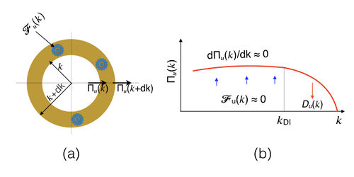 where \( \mathcal{F}_u(k) \) is the energy injection rate by the external force, here buoyancy. Physically, under steady state, the rate of change of energy flux of an inertial-range wavenumber shell \( (k, k+dk)\) is the difference between the energy injection rate by buoyancy (see Fig. 2).