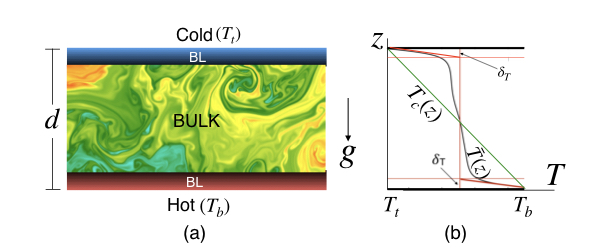 Thermal convection in realistic applications is quite involved due to complex configurations. Hence, to capture the essential features of turbulent thermal convection (TTC), a simple and generic model called Rayleigh-Bénard convection (RBC) is employed (Chandrasekhar 1961, Getling 1998). In RBC, a fluid is confined between a hot bottom plate and a cold top plate, which are separated by a distance d (see Fig. 1). We denote \( T_b - T_t = \Delta T \), where \( T_b \) and \( T_t \) are the respective temperatures of the bottom and top plates. The temperature varies sharply in the boundary layers, which are the regions near the plates.