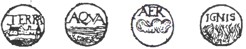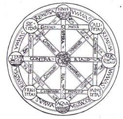 These four elements make up the four corners of a diamond (see picture). Opposing pairs of these are joined by a bar labeled "contraries" (earth-air, fire-water). At the four corners of the superimposed square are the four qualities defining the elements. Each adjacent pair of these is joined by a bar labeled "possible combination"; the diagonals joining them are labeled "impossible combination". Starting from the top, fire is formed from the combination of dryness and heat; air from wetness and heat; water from coldness and wetness; earth from coldness and dryness. This diagram is reproduced in several texts including Saemtliche Schriften und Briefe (Saemtliche Schriften und Briefe, Reihe VI, Band 1: 166, Loemker 1969: 83, 366, Karl Popp and Erwin Stein 2000: 33).