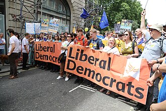 The Liberal Democrats, frequently known as the Lib Dems, were traditionally the third party in the United Kingdom but severely reduced their MPs and popular vote in the 2015 General Election. Their predecessors the Liberal Party declined severely before World War Two as the Labour Party took over as the main left-wing party. The Liberals were not a strong serious force in British politics, but they merged with the Social Democrat Party (a splinter group of the Labour Party) in 1988 to form the Liberal Democrats. The Liberal Democrats were hugely popular among students and have often been the go-to 'protest vote' of the middle classes. They also maintain traditional support bases among the elderly, and in areas such as the West Country. Advocating progressive taxation, nuclear disarmament and electoral reform, the Liberal Democrats saw a large surge in support as they were the only major party to seriously oppose the Iraq War. In a weird twist, they formed a coalition government with the Conservative Party in 2010, with the idea of 'taking the edge' off the Tory spending cuts and making them fairer for the poor. Their complete failure to do this severely damaged their support among students, public sector workers, all those affected by the budget cuts; they lost them a lot of support at local government level, losing them control of many local councils. in the 2015 election they lost nearly two-thirds of their support, and lost nearly 50 MPs. In 2019, they gained popularity for their strong anti-Brexit stance, and in 2024 they got their best result ever, taking many seats in the traditionally Tory "blue wall." Notable figures include Nick Clegg, Charles Kennedy (the UK's favourite alcoholic), Vince Cable (leader from 2017 - 2019), Jo Swinson (leader from July - December 2019), the bizarre Lembit Opik and former leader Paddy Ashdown, who effectively ran