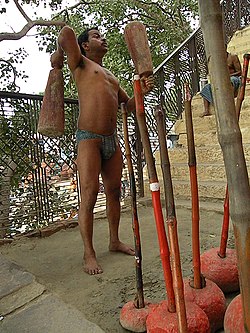 Langot is a male sports gear and undergarment, associated with almost every form of physically straining sports like kushti and kabaddi of Indian traditions. It has been worn by henchmen and sportsmen during practices and sessions, in a similar way to the contemporary use of gym shorts and jock briefs since ancient times. Wrestlers and bodyguards also wear a abdominal guard underneath, to protect and support their genitals.
