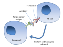 Antibody-dependent cell-mediated cytotoxicity (ADCC) requires antibodies to bind to target cell surfaces. Antibodies are formed of a binding region (Fab) and the Fc region that can be detected by immune system cells via their Fc surface receptors. Fc receptors are found on many immune system cells, including NK cells. When NK cells encounter antibody-coated cells, the latter's Fc regions interact with their Fc receptors, releasing perforin and granzyme B to kill the tumor cell. Examples include rituximab, ofatumumab, elotuzumab, and alemtuzumab. Antibodies under development have altered Fc regions that have higher affinity for a specific type of Fc receptor, FcγRIIIA, which can dramatically increase effectiveness.[40][41]