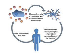 Dendritic cell therapy provokes anti-tumor responses by causing dendritic cells to present tumor antigens to lymphocytes, which activates them, priming them to kill other cells that present the antigen. Dendritic cells are antigen-presenting cells (APCs) in the mammalian immune system.[9] In cancer treatment, they aid cancer antigen targeting.[10] The only approved cellular cancer therapy based on dendritic cells is sipuleucel-T.