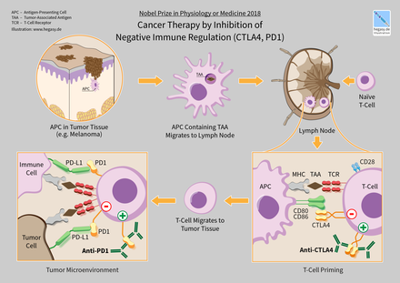 In 2018, American immunologist James P. Allison and Japanese immunologist Tasuku Honjo received the Nobel Prize in Physiology or Medicine for their discovery of cancer therapy by inhibition of negative immune regulation.[4]