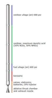 The rocket was to consist of individual pipes, each 27 cm in diameter and six meters long. Four of these pipes would be installed one above the other resulting in a 24 meter long fuel and oxidizer tank with a rocket engine at the lower end making up a CRPU. The fuel was intended to be kerosene with a 50/50 mixture of nitric acid and dinitrogen tetroxide as an oxidiser. Ignition was provided by a small quantity of furfuryl alcohol injected before the fuel, which ignites hypergolically (immediately and energetically) upon contact with the nitric acid. To simplify the design, pumps were not used to move the fuel to the engines, instead the fuel tanks were only 66% filled, with compressed air in the remaining space to press propellants into the ablatively cooled combustion chamber. Thrust control is by partially closing the electromechanical propellant valves. Pitch and yaw control can thus be achieved by differential throttling. In principle this is extremely reliable and cheap in mass production.