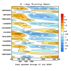 The Madden–Julian oscillation (MJO) is an equatorial traveling pattern of anomalous rainfall that is planetary in scale. It is characterized by an eastward progression of large regions of both enhanced and suppressed tropical rainfall, observed mainly over the Indian and Pacific Oceans. The anomalous rainfall is usually first evident over the western Indian Ocean, and remains evident as it propagates over the very warm ocean waters of the western and central tropical Pacific. This pattern of tropical rainfall then generally becomes very faint as it moves over the cooler ocean waters of the eastern Pacific, but reappears over the tropical Atlantic and Indian Oceans. The wet phase of enhanced convection and precipitation is followed by a dry phase where convection is suppressed. Each cycle lasts approximately 30–60 days. The MJO is also known as the 30 to 60-day oscillation, 30 to 60-day wave, or the intraseasonal oscillation.