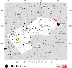 The Carina Dwarf Spheroidal Galaxy is a dwarf galaxy in the Carina constellation. It was discovered in 1977 with the UK Schmidt Telescope by Cannon et al.[5][6] The Carina Dwarf Spheroidal galaxy is a satellite galaxy of the Milky Way and is receding from it at 230 km/s.[1] The diameter of the galaxy is about 1600 light-years, which is 75 times smaller than the Milky Way.[7] Most of the stars in the galaxy formed 7 billion years ago,[8] although it also experienced bursts of star formation about 13 and 3 billion years ago.[9] It is also being tidally disrupted by the Milky Way galaxy.[10]