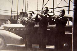 Trumpet-like instruments have historically been used as signaling devices in battle or hunting, with examples dating back to at least 2000 BC.[1] They began to be used as musical instruments only in the late 14th or early 15th century.[2] Trumpets are used in art music styles, for instance in orchestras, concert bands, and jazz ensembles, as well as in popular music. Sound is produced by vibrating the lips in a mouthpiece,[3] which starts a standing wave in the air column of the instrument. Since the late 15th century, trumpets have primarily been constructed of brass tubing, usually bent twice into a rounded rectangular shape.