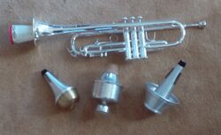 Various types of mutes can be placed in or over the bell, which decreases volume and changes timbre.[26] Of all brass instruments, trumpets have the widest selection of mutes: common mutes include the straight mute, cup mute, harmon mute (wah-wah or wow-wow mute, among other names[27]), plunger, bucket mute, and practice mute.[28] When the type of mute is not specified, players generally use a straight mute, the most common type.[27] Jazz, commercial, and show band musicians often use a wider range of mutes than their classical counterparts,[26] and many mutes were invented for jazz orchestrators.[29]