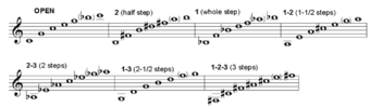 The fingering schema arises from the length of each valve's tubing (a longer tube produces a lower pitch). Valve "1" increases the tubing length enough to lower the pitch by one whole step, valve "2" by one half step, and valve "3" by one and a half steps.[23] This scheme and the nature of the overtone series create the possibility of alternate fingerings for certain notes. For example, third-space "C" can be produced with no valves engaged (standard fingering) or with valves 2–3. Also, any note produced with 1–2 as its standard fingering can also be produced with valve 3 – each drops the pitch by 1 1⁄2 steps. Alternate fingerings may be used to improve facility in certain passages, or to aid in intonation. Extending the third valve slide when using the fingerings 1–3 or 1-2-3 further lowers the pitch slightly to improve intonation.[24]