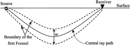 Schematic illustration of the first Fresnel zone for one source-receiver pair. W indicates the width of the first Fresnel zone.