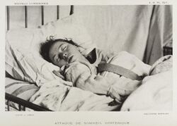 Jean-Martin Charcot argued that hysteria derived from a neurological disorder and showed that it was more common in men than women.[4] Charcot's theories of hysteria being a physical condition of the mind and not of the body led to a more scientific and analytical approach to hysteria in the 19th century. He dispelled the beliefs that hysteria had anything to do with the supernatural and attempted to define it medically.[15] Charcot's use of photography,[16] and the resulting concretization of women's expressions of health and distress, continued to influence women's experiences of seeking healthcare.[17] Though older ideas persisted during this era, over time female hysteria began to be thought of less as a physical ailment and more of a psychological one.[18]