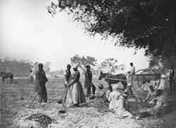 A story from a former slave, Mary Middleton, a Gullah woman from the South Carolina Sea Islands, told of an incident of a slaveholder who was physically weakened from conjure. A slaveholder beat one his slaves badly. The slave he beat went to a conjurer and the conjurer made the slaveholder weak by sunset. Middleton said, "As soon as the sun was down, he was down too, he down yet. De witch done dat." Bishop Jamison was born enslaved in Georgia in 1848 and wrote an autobiographical account of his life. On a plantation in Georgia there was an enslaved Hoodoo man named Uncle Charles Hall who prescribed herbs and charms for slaves to protect themselves from white people. Hall instructed the slaves to anoint roots three times daily and chew and spit roots towards their enslavers for their protection.[56] Another slave story talked about an enslaved woman named Old Julie who was a conjure woman and was known among the slaves on the plantation to conjure death. Old Julie conjured so much death, her slaveholder sold her away to stop her from killing people on the plantation with conjure. Her enslaver put her on a steamboat to take her to her new slaveholder in the Deep South. According to the stories of freedmen after the Civil War, Old Julie used her conjure powers to turn the steamboat around back to where the boat was docked, which forced her slaveholder who tried to sell her away to keep her.[57]