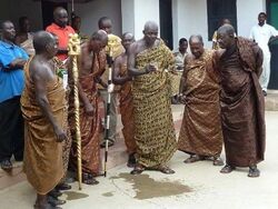 The practice of carving snakes onto "conjure sticks" to remove curses, evil spirits, and bring healing was found in African American communities in the Sea Islands among the Gullah Geechee people. Snake reverence in African American Hoodoo originated from West African societies.[171] Another practice in Hoodoo that has its origins from West Africa is to moistened conjure bags and luck balls with whiskey (rum). It is believed that conjure bags and luck balls have a spirit, and to keep its spirit alive conjurers feed them whisky once a week. The practice has its roots from the Guinea Coast of Africa.[172] The practice of foot-track magic in Hoodoo has its origins from Ghana. A person's foot track is used to send someone away by mixing their foot track with herbs, roots, and insects, specific ingredients used in Hoodoo to send someone away, and grind into a powder and place the powder in a container and throw it into a flowing river that leaves town and in a few days the person will leave town.[173][174] Among the Tshi people in Ghana, spirit possession is not limited to people, but objects inanimate and animate can become possessed by spirits. This same belief among Black people in the South was documented by folklorist Puckett.[175]