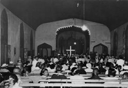 Another spiritual institution African Americans hid their Hoodoo practices was in the Sanctified Church started in Memphis, Tennessee.[360] Bishop Charles Harrison Mason and other African American ministers founded the Church of God in Christ in the early twentieth century which has a predominantly African American membership. Bishop Charles Harrison Mason was known among the members of his congregation to heal church members using roots, herbs and anointing oil. Bishop Mason and other Pentecostal pastors were rootworkers and used spiritual tools to remove demons and curses off church members. The removal of evil spirits from church members in Black Pentecostal churches involves prayer, playing Black gospel music, anointing oils and other Hoodoo tools.[361] Author Zora Neal Hurston wrote in her book The Sanctified Church, the spiritual beliefs and conjure practices of the Black congregation in Sanctified Churches. African Americans talked about nailing a horse shoe over the door to ward off evil and making conjure balls to remove diseases. British historians traced the origins of the creation of conjure balls in Hoodoo to the West African practice of creating gris-gris charms and the Central African practice of creating minkisi containers.[362] As white spiritual merchants exploited hoodoo and turned it into just tricks and spells, African Americans moved more of the traditional Hoodoo practices of animal sacrifice, incorporating animal parts in spiritual work, Holy Ghost shouting,[363] the ring shout, and other practices were synchronized with Christianity which took the Hoodoo practiced by African Americans underground. Some Sanctified Churches in African American communities continue to incorporate Hoodoo.[364][365] African American religious institutions are not just places of worship and spirituality, but are also places to discuss injustices in their communities and how to unite to bring about political and spiritual transformations for African Americans.[366]