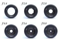Light enters the camera through an aperture, an opening adjusted by overlapping plates called the aperture ring.[11][12][13] Typically located in the lens,[14] this opening can be widened or narrowed to alter the amount of light that strikes the film or sensor.[11] The size of the aperture can be set manually, by rotating the lens or adjusting a dial or automatically based on readings from an internal light meter.[11]