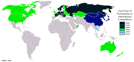 Interest in this kind of on-foot radio direction finding activity using detailed topographic maps for navigation spread throughout Scandinavia, Eastern and Central Europe, the Soviet Union, and the People's Republic of China. Formal rules for the sport were first proposed in England and Denmark in the 1950s.[3][unreliable source?] The first European Championship in the sport was held in 1961 in Stockholm, Sweden. Four additional international championships were held in Europe in the 1960s, and three more were held in the 1970s. The first World Championship was held in 1980 in Cetniewo, Poland , where competitors from eleven European and Asian countries participated. World Championships have been generally held in even-numbered years since 1984, although there was no World Championship in 1996, and there was a World Championship in 1997. Asian nations began sending national teams to international events in 1980, and teams from nations in Oceania and North America began competing in the 1990s. Athletes from twenty-six nations attended the 2000 World Championship in Nanjing, China, the first to be held outside of Europe.[|permanent dead link|dead link}}][4]