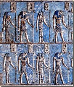 ![]() Kauket (left) and Kek (right) sitting on thrones, relief from a temple at Deir el-Medina | |