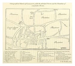 In 1816, Huydecooper described Kumasi as having clean and straight streets with "houses excellently built, the latter being fairly tall but for the most part only one story."[8] A year later, Thomas Edward Bowdich documented that the central city, with the exclusion of suburbs such as Bantama and Asafo - was oblong shaped and had a perimeter of approximately 4 miles. Four of its principal streets according to Bowdich, were half a mile long and about 50 to 100 yards wide. Bowdich also notes that Kumasi's streets were named and a "superior captain" was placed in charge of each street.[8] At the time of Bowdich's visit in 1817, Kumasi had 27 streets and by the mid-1880s, another source identified 50 streets.[13] The palace complex was located in the eastern quarter of the central city.[8] Bowdich refers to a piazza 200 yards long that "lines the interior of the wall secluding the palace."[8] For sanitation, Bowdich recorded the presence of public toilets on the outskirt of town and the existence of toilets in each house as well. They were "not unfrequently upstairs" and boiling water was poured in daily to prevent "the least offence." The waste of houses was burned behind the street every morning.[14][15]