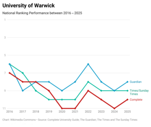 Warwick is consistently ranked amongst the top ten in the three major national rankings of British universities. Warwick is a member of the 'Sutton 13' of top ranked universities in the UK.[98] Warwick was declared as The Times and The Sunday Times "University of the Year" 2015.[99] Overall, nineteen of the twenty-seven subjects offered by Warwick were ranked within the top 10 nationally in 2019 by the Complete University Guide.[100] In 2017, Warwick was named as the university with the joint second highest graduate employment rate of any UK university, with 97.7% of its graduates in work or further study three and a half years after graduation.[101]