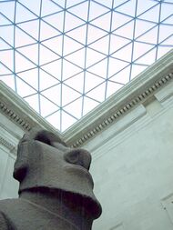 Museums furnished by colonial looting have largely shaped the way a nation imagines its dominion, the nature of the human beings under its power, the geography of the land, and the legitimacy of its ancestors, working to suggest a process of political inheriting.[50] It is necessary to understand the paradoxical way in which the objects on display at museums are tangible reminders of the power held by those who gaze at them.[51] Eliot Colla describes the structure of the Egyptian sculpture room in the British Museum as an assemblage that "form[s] an abstract image of the globe with London at the center".[52] The British Museum, as Colla describes, presents a lesson of human development and progress: "the forward march of human civilization from its classical origins in Greece and Rome, through Renaissance Italy, to modern-day London".[52]