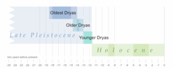The gradual warming since the Last Glacial Maximum (27,000 to 24,000 years BP) has been interrupted by two cold spells: the Older Dryas and the Younger Dryas (c. 12,900–11,650 BP). In northern Scotland, the glaciers were thicker and deeper during the Older Dryas than the succeeding Younger Dryas, and there is no evidence of human occupation of Britain.[2] In Northwestern Europe there was also an earlier Oldest Dryas (18.5–17 ka BP 15–14 ka BP).[3] The Dryas are named after an indicator genus, the Arctic and Alpine plant Dryas octopetala, the remains of which are found in higher concentrations in deposits from colder periods.