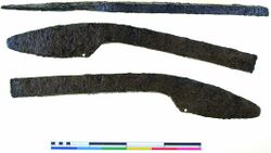 Its earliest design consisted of a knife-like blade.[3][1] In 2011 an early medieval coulter was excavated from a site in Kent, England.[4][5] Coulters using a flat rotating disc began being used c. 1900.[6][1] Its advantage was a smoothly cut bank, and it sliced plant debris to the width of the furrow.[2]