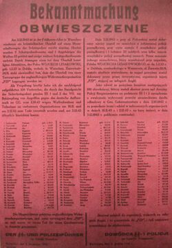 During the Nazi occupation of Poland, the Germans applied collective responsibility: any kind of help given to a person of Jewish faith or origin was punishable by death, and that not only for the rescuers themselves but also for their families.[7][8][9] This was widely publicized by the Germans.[10][11] During the occupation, for every German killed by a Pole, 100–400 Poles were shot in retribution.[12] Communities were held collectively responsible for the purported Polish counter-attacks against the invading German troops. Mass executions of roundup (pol: łapanka) hostages were conducted every single day during the Wehrmacht advance across Poland in September 1939 and thereafter.[13] Poland lost over 5 million citizens during the occupation by Nazi Germany, mostly civilians.[14]