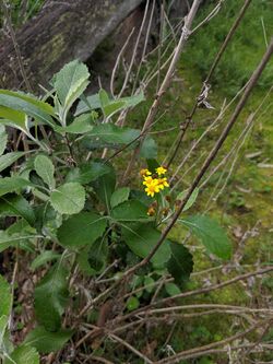 Senecio garlandii is an erect, perennial shrub that grows to a height of 1.2 metres (3 ft 11 in). The stems and lower leaf surface are densely covered with white, cottony hairs, whilst the leaves grow to 15 cm long and 8 cm wide, with toothed edges. The leaves are stalkless, and clasp the stem. The numerous small flower heads are clustered in sprays, and mature into light brown fruits that are grooved and covered with slender white hairs.[3][4][5]