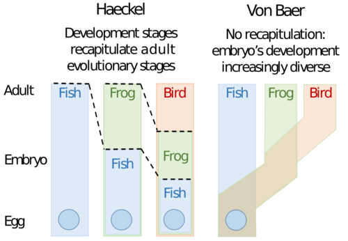 Embryology theories of Ernst Haeckel (following Meckel) and Karl Ernst von Baer compared. Von Baer denied any recapitulation of whole adult forms, though individual structures might be recapitulated.