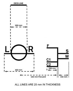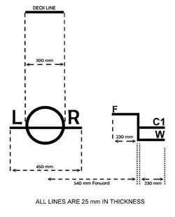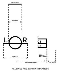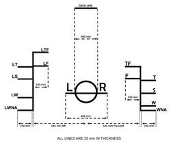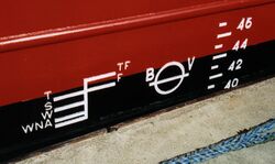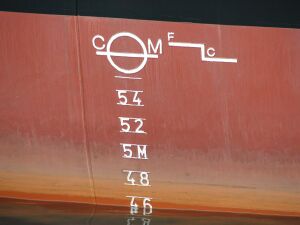 The timber fresh and the tropical timber fresh load lines are calculated in a similar way to the freshwater and tropical freshwater load lines, except that the displacement used in the formula is that of the vessel at her summer timber load draft. If this cannot be ascertained, then these marks will be one forty-eighth of the timber summer draft above the timber summer and timber tropical marks, respectively.[1]