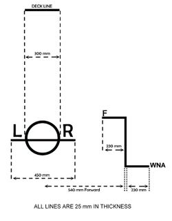 Letters may also appear to the sides of the mark indicating the classification society that has surveyed the vessel's load line. The initials used include AB for the American Bureau of Shipping, BV for Bureau Veritas, VL for DNV GL, IR for the Indian Register of Shipping, LR for Lloyd's Register, NK for Nippon Kaiji Kyokai and RI for the Registro Italiano Navale. These letters are approximately 115 millimetres in height and 75 millimetres in width (4.5 by 3.0 in).[9] The load line length is referred to during and following load line calculations.