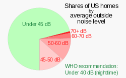 Sudden impulse noises are typically perceived as more bothersome than noise from traffic of equal volume.[40] Annoyance effects of noise are minimally affected by demographics, but fear of the noise source and sensitivity to noise both strongly affect the 'annoyance' of a noise.[41] Sound levels as low as 40 dB(A) can generate noise complaints[42] and the lower threshold for noise producing sleep disturbance is 45 dB(A) or lower.[43]