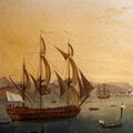 French ships (left), flying the white flag of the Monarchy, at the battle of Chesapeake (1781).