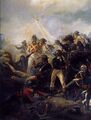 The surrender of Lord Cornwallis to French (left) and American (right) colonial forces after the battle of Yorktown (1781).