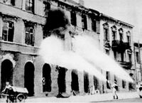 As German troops began torching Warsaw buildings in August 1944, Miłosz was captured and held in a prisoner transit camp; he was later rescued by a Catholic nun—a stranger to him—who pleaded with the Germans on his behalf.[41] Once freed, he and Janina escaped the city, ultimately settling in a village outside Kraków, where they were staying when the Red Army swept through Poland in January 1945, after Warsaw had been largely destroyed.[42]