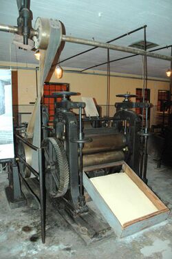 In 1836, Edwin M. Chaffee, of the Roxbury India Rubber Company, patented a four-roll calender to make rubber sheet.[5] Chaffee worked with Charles Goodyear with the intention to "produce a sheet of rubber laminated to a fabric base".[6] Calenders were also used for paper and fabrics long before later applications for thermoplastics. With the expansion of the rubber industry the design of calenders grew as well, so when PVC was introduced the machinery was already capable of processing it into film.[6] As recorded in an overview on the history of the development of calenders, "There was development in both Germany and the United States and probably the first successful calendering of PVC was in 1935 in Germany, where in the previous year the Hermann Berstorff Company of Hannover designed the first calender specifically to process this plastic".[6]